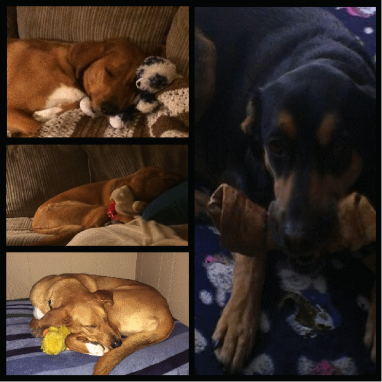 “In some ways, the differences parallel their personalities—Molly as a brute and Morgan as a sweetheart. The differences also show how both dogs sometimes stray from their normal behavior, notably through how they interact with their favorite toys. Taken collectively, however, their differences don’t stop the law of attraction from coming into play. Though they like a different look, like to play with different toys, and like to relax differently, they adore each other and cuddle up together at every opportunity.”
