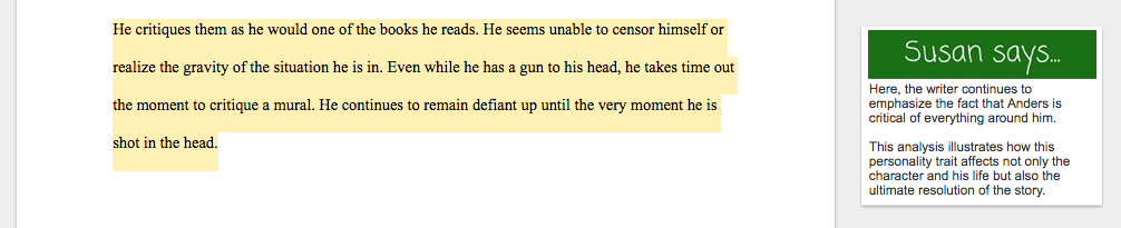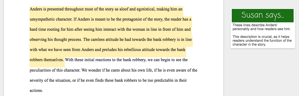 The character analysis essay examples below analyze characters from short stories. I’ve included a variety of comments to help you see what these writers do well and what they might do to improve their analyses.